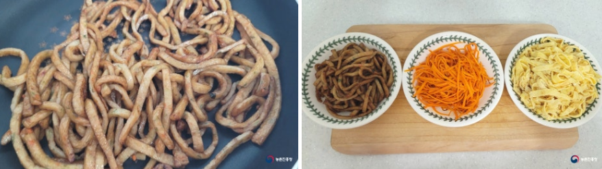 5. 야채어묵도 가늘게 채 썰고, 노릇하게 볶아줍니다. 기호에 따라 간장을 약간 넣어도 좋습니다.
