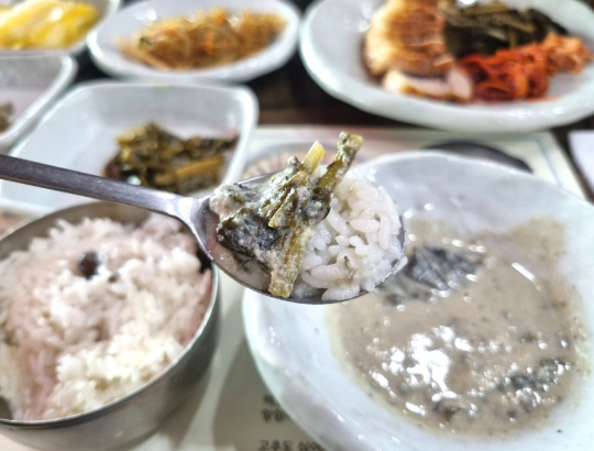 길목의 추천 메뉴이자 대표 메뉴는 '꺼먹지 정식'입니다. '꺼먹지'는 당진의 전통음식으로 소금에 절인 무청을 말합니다. 정식을 주문하면 서리태 콩탕과 고소한 수육, 10가지 기본 반찬이 함께 차려집니다.