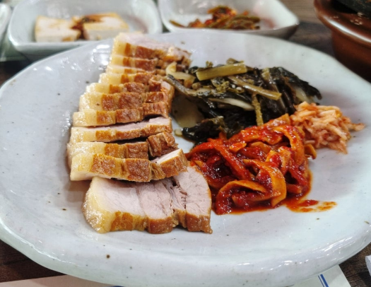 꺼먹지는 서리태 콩탕에도 들어갑니다. 콩국물의 고소한 맛에 깊이를 더해 줍니다. 수육은 사장님 추천대로 꺼먹지와 무말랭이에 곁들이고 백김치에도 싸서 먹으면 담백한 돼지고기와 너무 잘 어울려 계속 손이 갑니다.