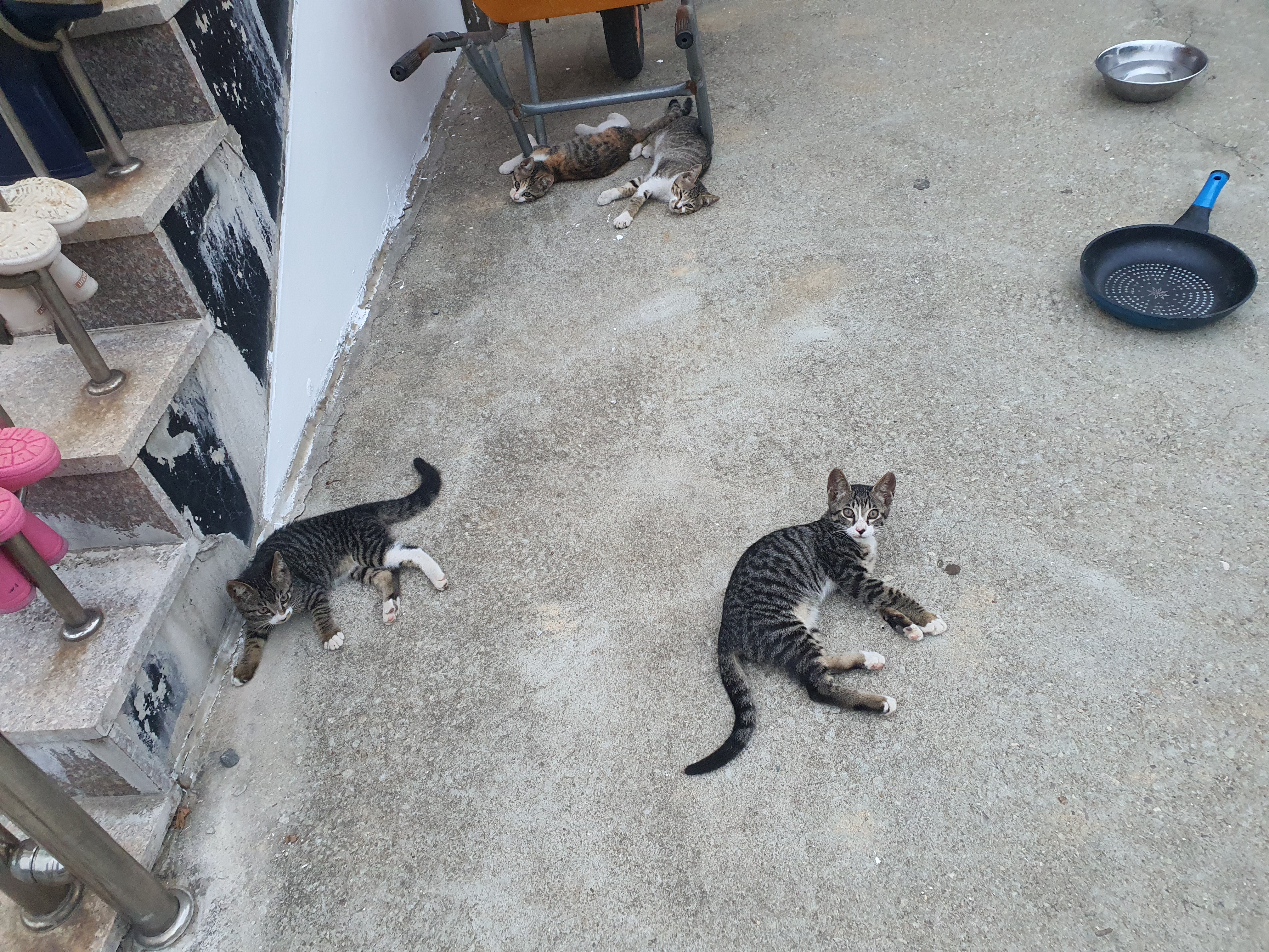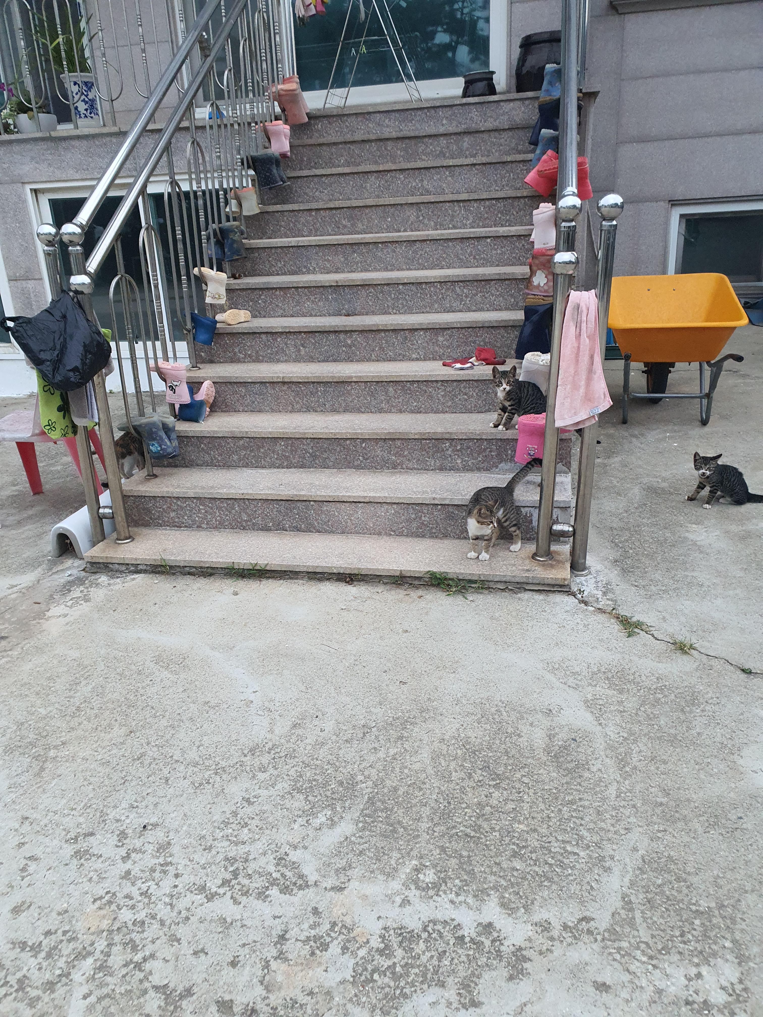장화들이 편히 쉬는 계단에 아기 고양이 세 네 마리가 저를 봅니다.