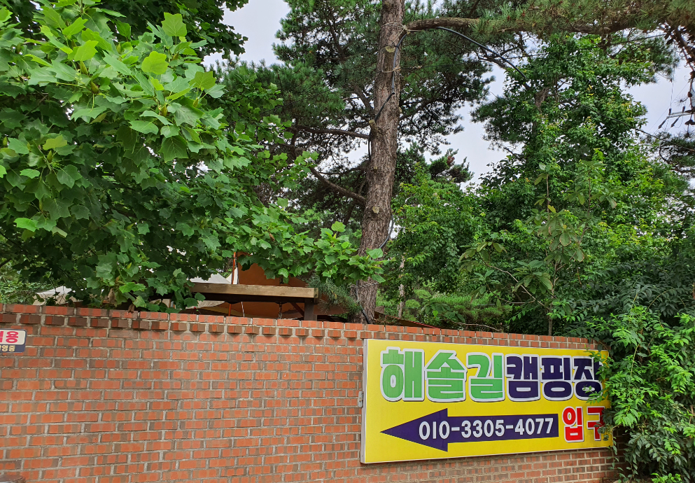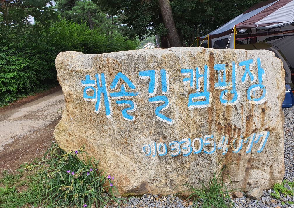 네비언니 말 잘 듣고 오시면 이렇게 해솔길캠핑장 입구 간판이 보입니다.