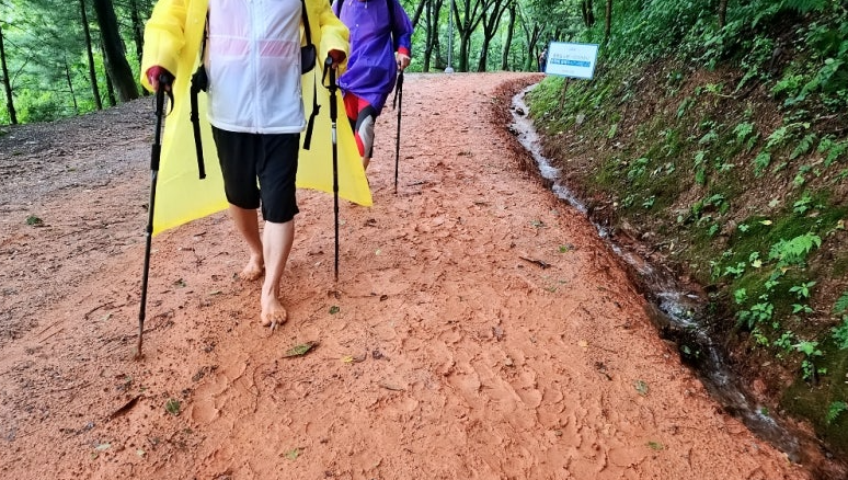 빗물에 젖어 질척이는 계족산 황톳길을 찾는 사람들이 평일인데도 꽤 많았습니다. 혹시 미끄러질 수 있으니 등산 스틱을 이용해 조심스럽게 한 발씩 내디뎠습니다.