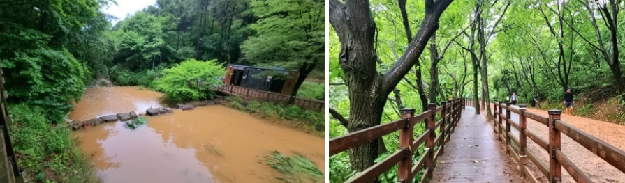 싱그러운 초록 숲으로의 맨발 걷기는 청량감마저 들고 산에서 흘러내리는 작은 폭포수가 있어 무더운 여름에 시원함에 좋습니다. 황톳길 옆으로 계곡도 있어서 물 흐르는 소리와 시원한 숲 바람이 일어 폐부까지 뻥 뚫리는 느낌이 듭니다.