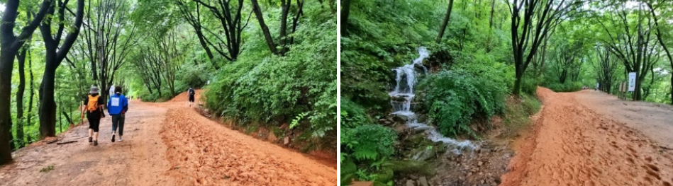 싱그러운 초록 숲으로의 맨발 걷기는 청량감마저 들고 산에서 흘러내리는 작은 폭포수가 있어 무더운 여름에 시원함에 좋습니다. 황톳길 옆으로 계곡도 있어서 물 흐르는 소리와 시원한 숲 바람이 일어 폐부까지 뻥 뚫리는 느낌이 듭니다.