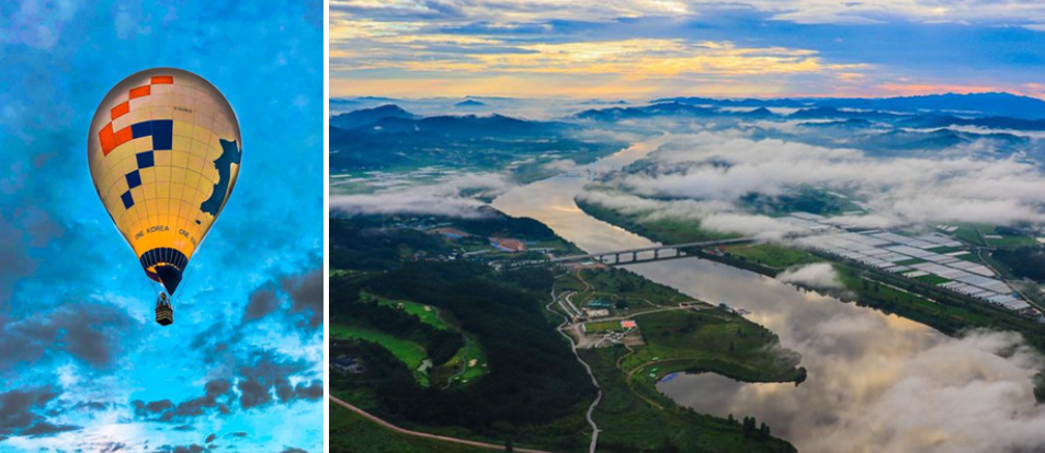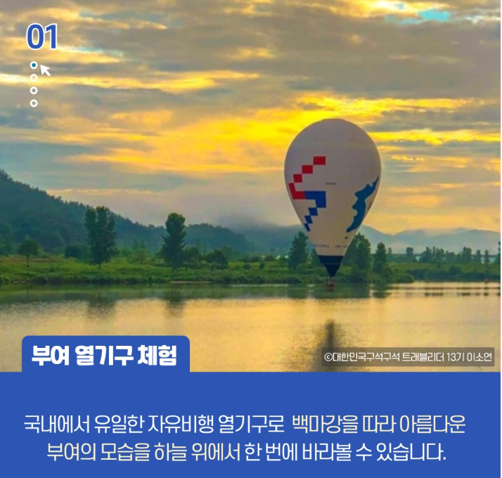 먼저, '부여'를 즐길 수 있는 특별한 방법을 소개해 드리겠습니다. 하늘에서 부여의 멋진 경관을 바라볼 수 있는 열기구를 체험해 보세요!