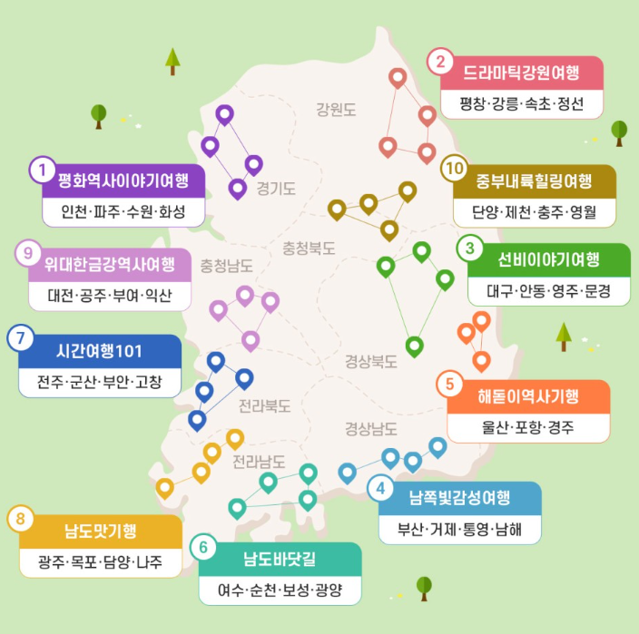 대한민국 테마여행 10선은 ①평화역사이야기여행(인천·파주·수원·화성) ②드라마특강원여행(평창·강릉·속초·정선) ③선비이야기여행(대구·안동·영주·문경) ④남쪽빛감성여행(부산·거제·통영·남해) ⑤해돋이역사기행(울산·포항·경주) ⑥남도바닷길(여순·순천·버성·광양) ⑦시간여행101(전주·군산·부안·고창) ⑧남도맛기행(광주·목포·담양·나주) ⑨위대한금강역사여행(대전·공주·부여·익산) ⑩중부내륙힐링여행(단양·제천·충주·영월)로 지역관광 활성화를 위해 39개 지자체를 선정, 전국의 10개 권역으로 묶어 대한민국 대표 관광지로 육성하고 주제가 있는 여행을 즐길 수 있도록 문화체육관광부와 한국관광공사가 진행하는 국내여행 활성화 사업입니다.
