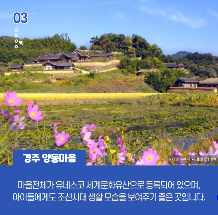 양동마을 코스마다 관련된 이야기 중심의 해설 덕분에 어린아이들도 양동마을과 고택에 관한 이야기를 더욱 쉽게 이해할 수 있으며, 새소리도 듣고 예쁜 꽃들을 보며 지친 마음을 치유할 수 있는 여행 코스입니다.