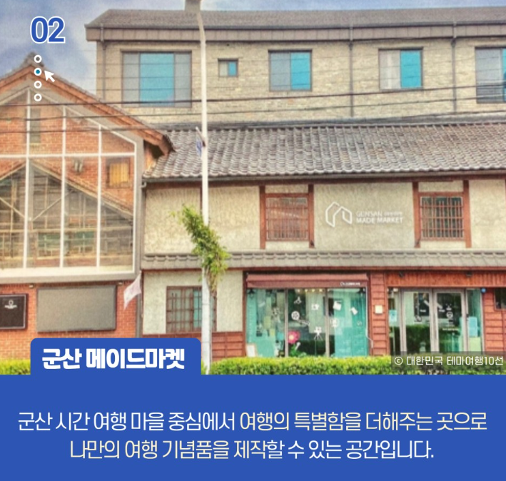 다음으로 다양한 핸드메이드 클래스를 만날 수 있는 '군산'입니다. 군산 시간여행을 통해 군산과 이어지며, 내 손으로 만드는 감성 여행을 즐길 수 있습니다.