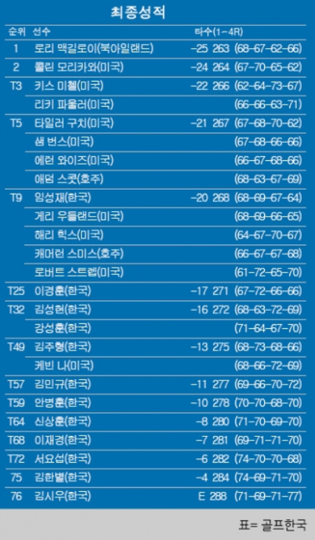 이후 마지막 18번홀까지 파를 지킨 매킬로이는 이날만 6언더파 66타를 치며 최종합계 25언더파 263타로 역전 우승에 성공했다고 합니다.