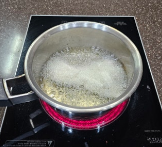 4. 식용유 2컵을 붓고 170도까지 온도가 올라가면 도라지를 넣고 4분간 튀긴 후 건져줍니다.