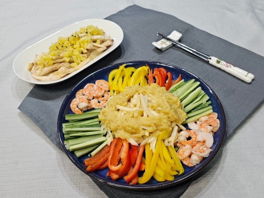 도라지 6개, 오이 작은것 1개, 노란 파프리카 1/4개, 빨간 파프리카 1/4개, 소금 1/2T, 칵테일새우 10마리, 사과 냉채 소스(사과 1/3개, 소금 약간, 설탕 1스푼, 들깻가루 1/2t