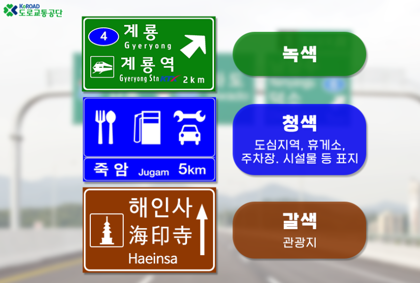 👉 고속도로 : 청색 바탕, 백색 글자. 자동차만 다닐 수 있는 자동차 전용 도로.