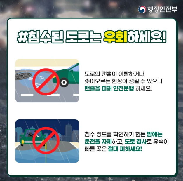 침수된 도로는 우회해야 합니다. 도로의 맨홀이 이탈하거나 솟아오르는 현상이 생길 수 있어 맨홀을 피해 안전 운행합니다.