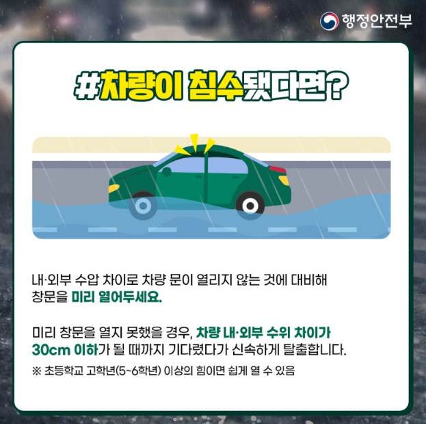 자동차 내·외 수압 차이로 차량 문이 열리지 않는 것에 대비해 창문을 미리 열어둡니다.