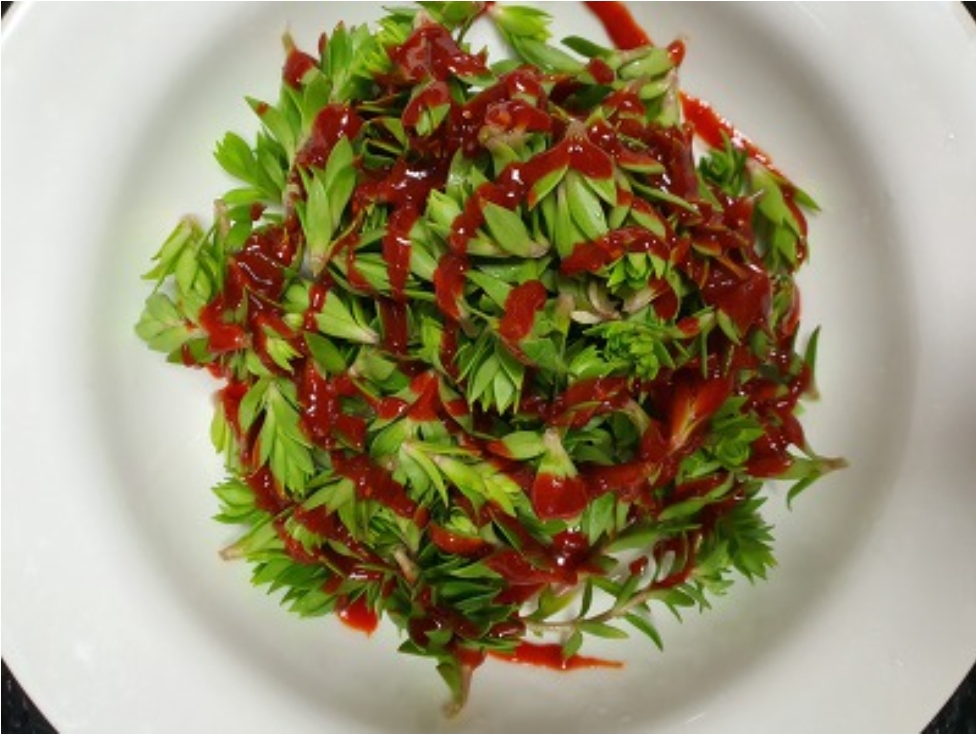 봄에서 여름에 걸쳐 어린잎과 줄기를 나물로 많이 무쳐먹는데 특히 비타민C가 많고 인산이 풍부하며 새콤한 신맛도 있어 식욕을 촉진하는 건강식품으로 각광을 받는다고 합니다. 최근에는 비닐하우스에서 다량 재배하여 도시에 공급합니다.