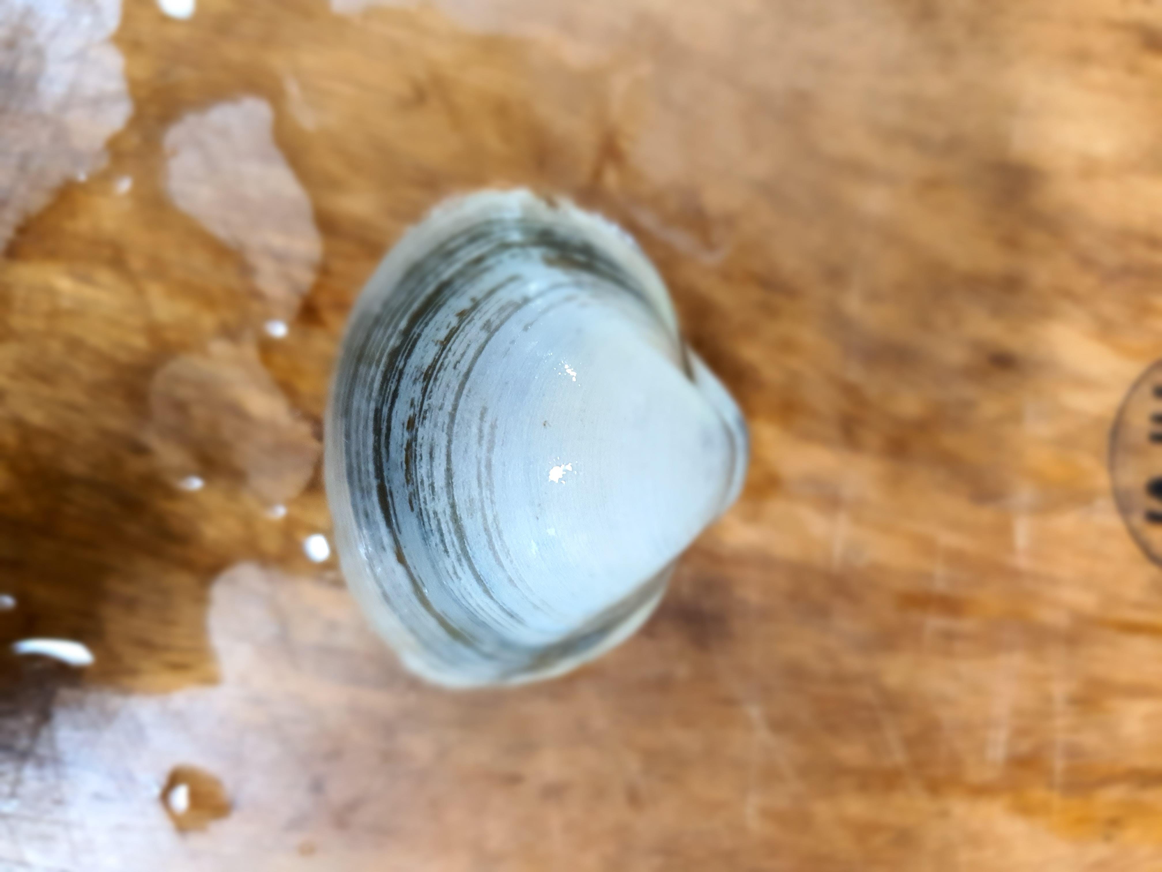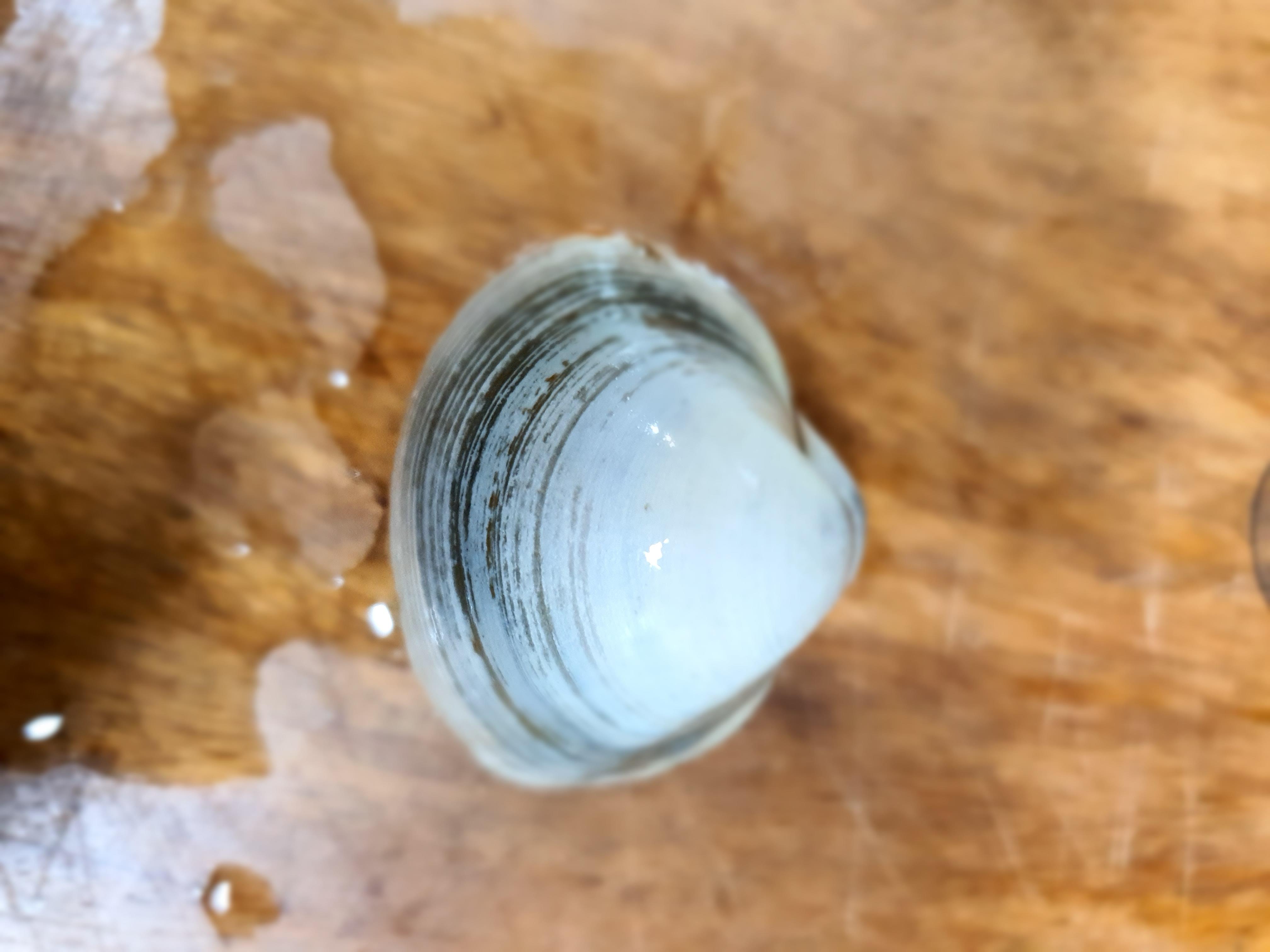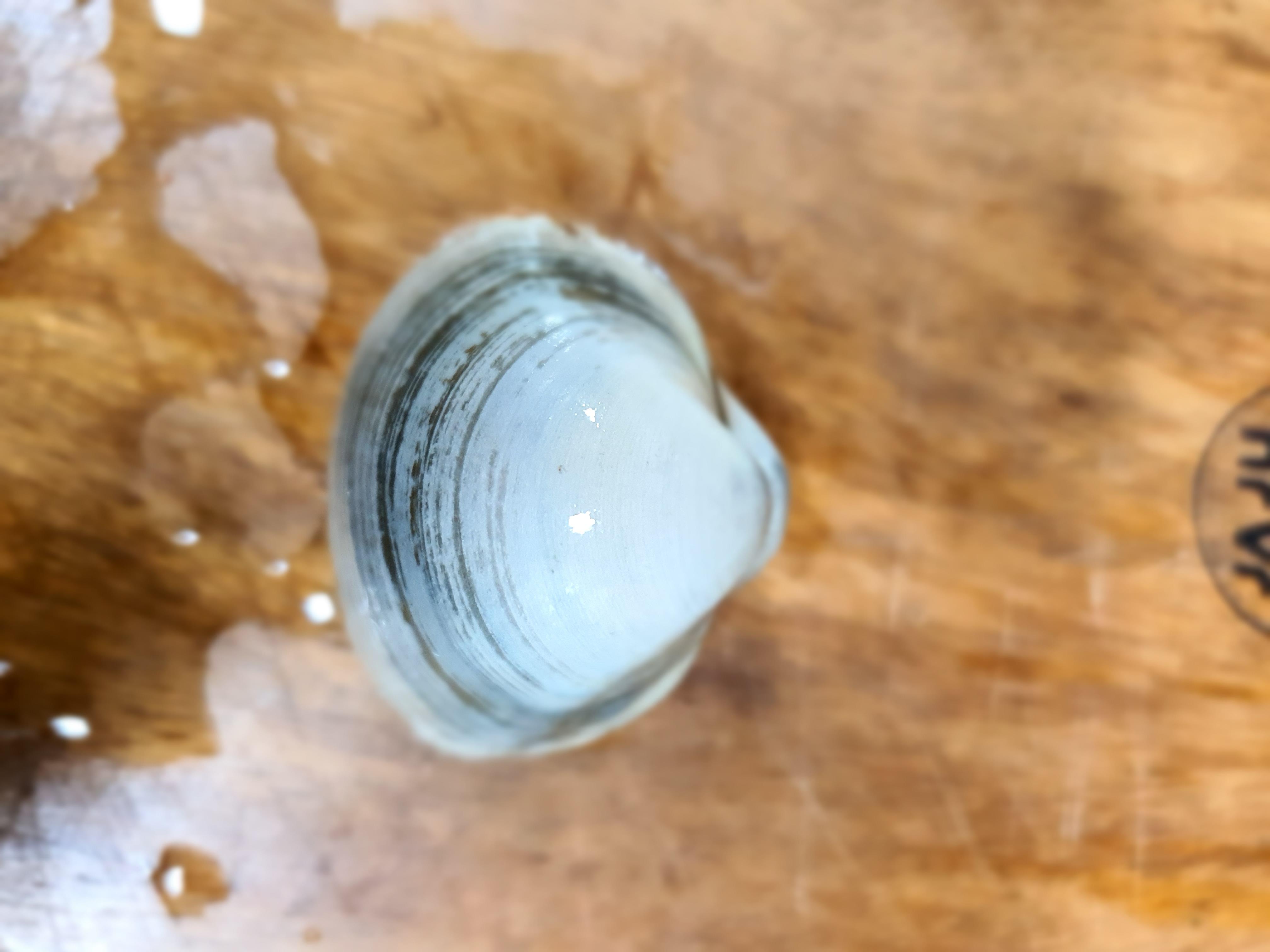 동죽은 껍질은 둥근 삼각형 모양이고 회백색이며 껍질의 안쪽은 흰색입니다. 하지만 서식하는 갯벌에 따라 색이 조금 다르기도 하다고 합니다. 둥근 검은 선이 있는데 이것은 동죽조개의 나이를 나타낸다고 합니다.