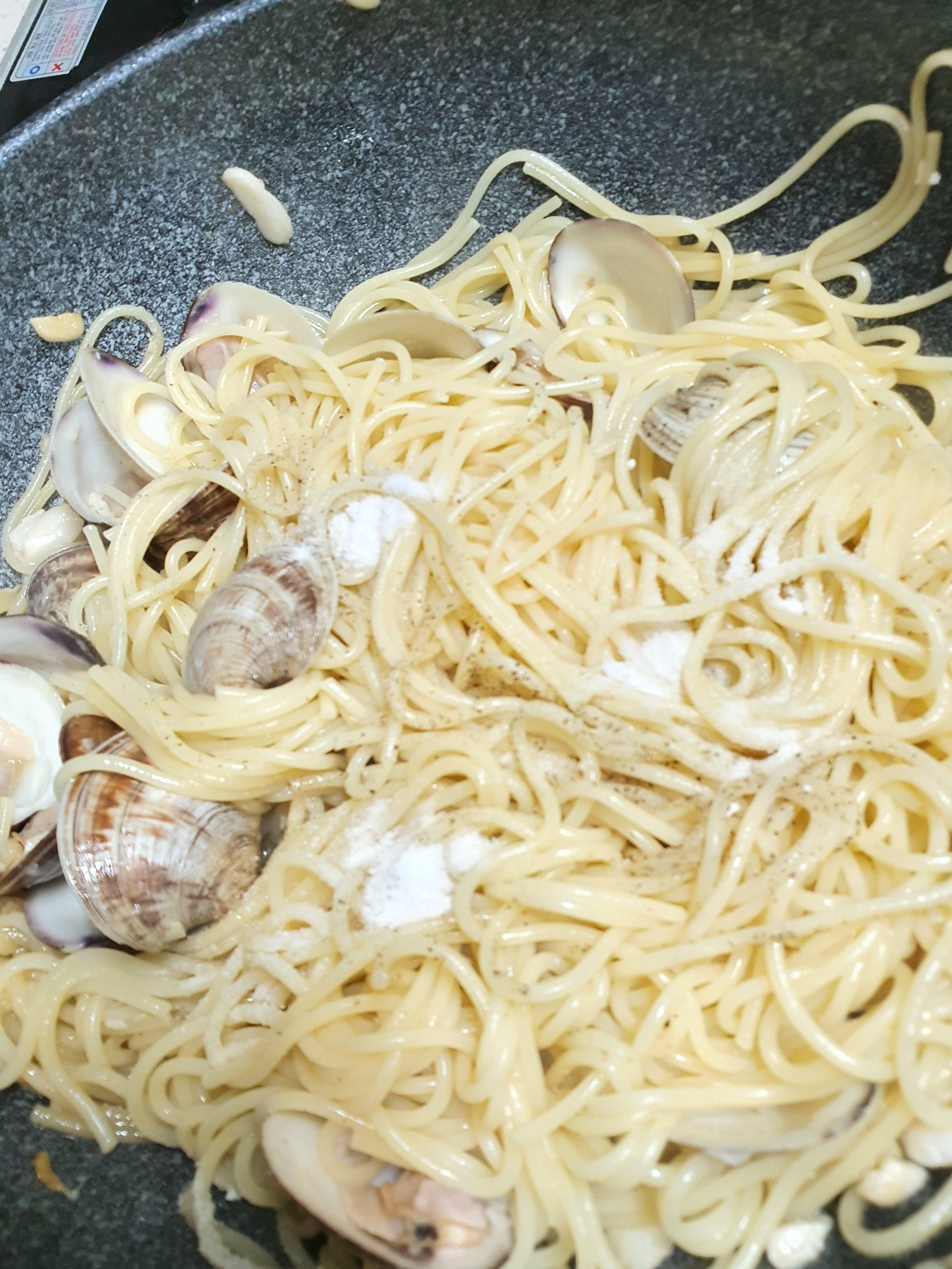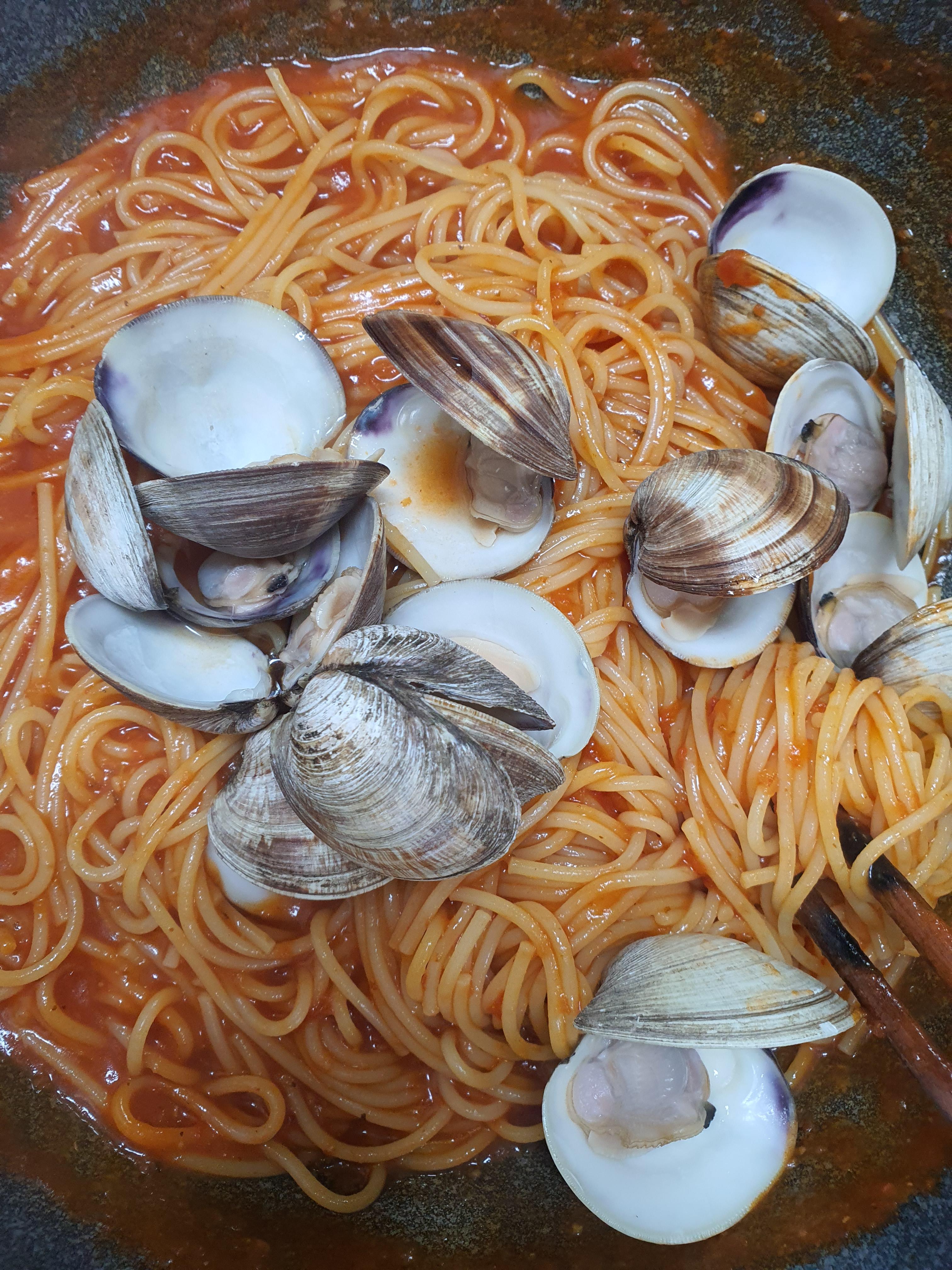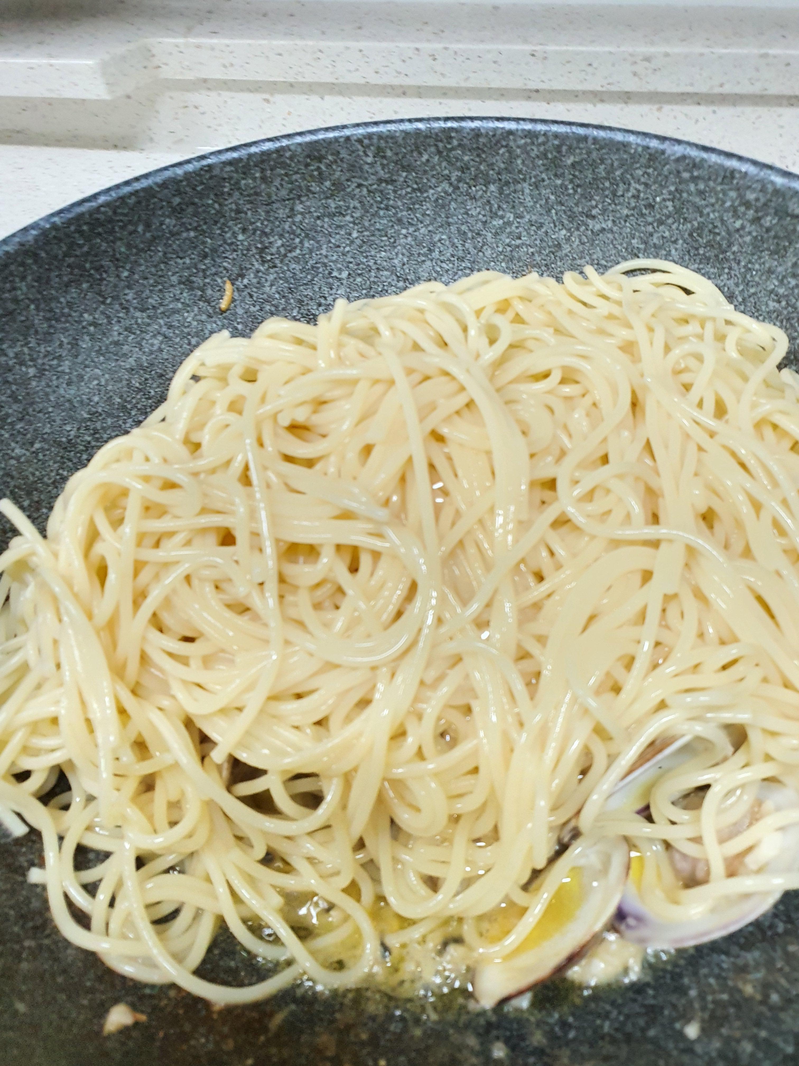 5. 생합이 입을 벌리면 면수와 스파게티 면을 넣고 볶다가 소금과 후추로 간을 맞추면 끝 ^^