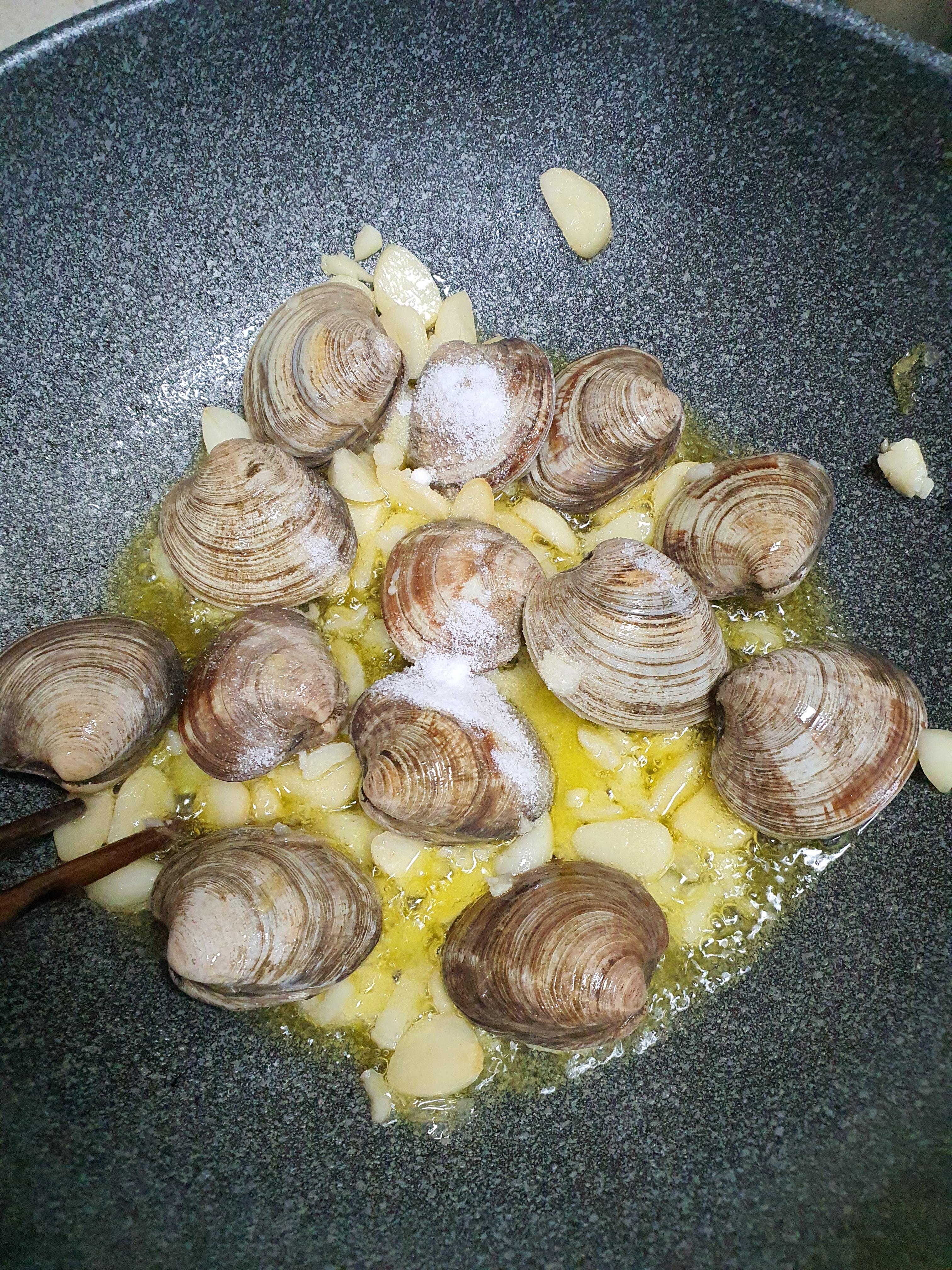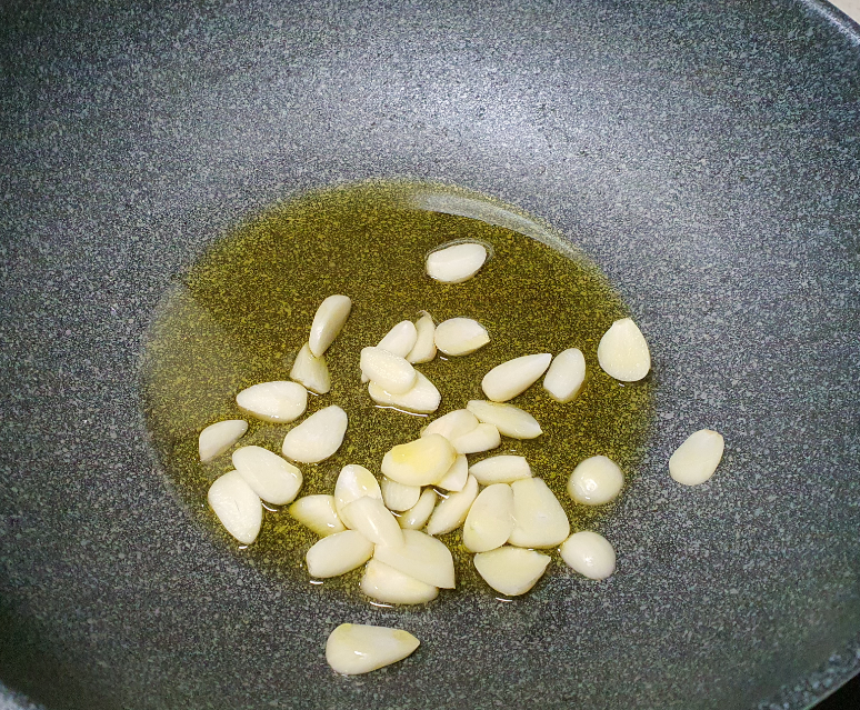 4. 웍에 올리브유를 넣고 편마늘을 볶아주다가 생합을 넣고 조금 볶다가 으깬마늘을 넣어줍니다.