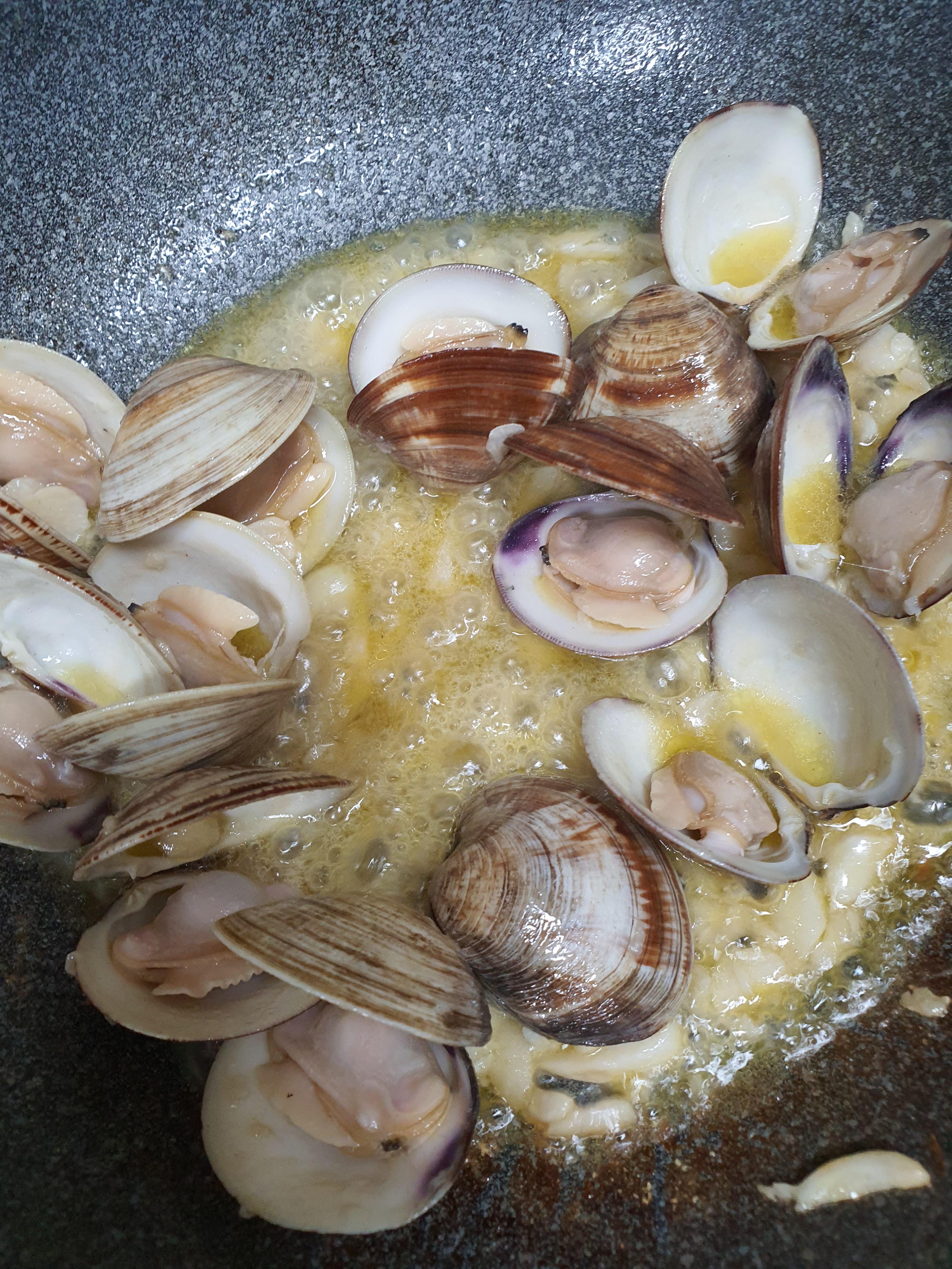 (이때 마늘이 노릇할때 까지 볶아주지만 생합 껍질이 두꺼워 생합이 입을 벌릴때까지 볶아주어도 마늘이 노릇하게 익습니다.)