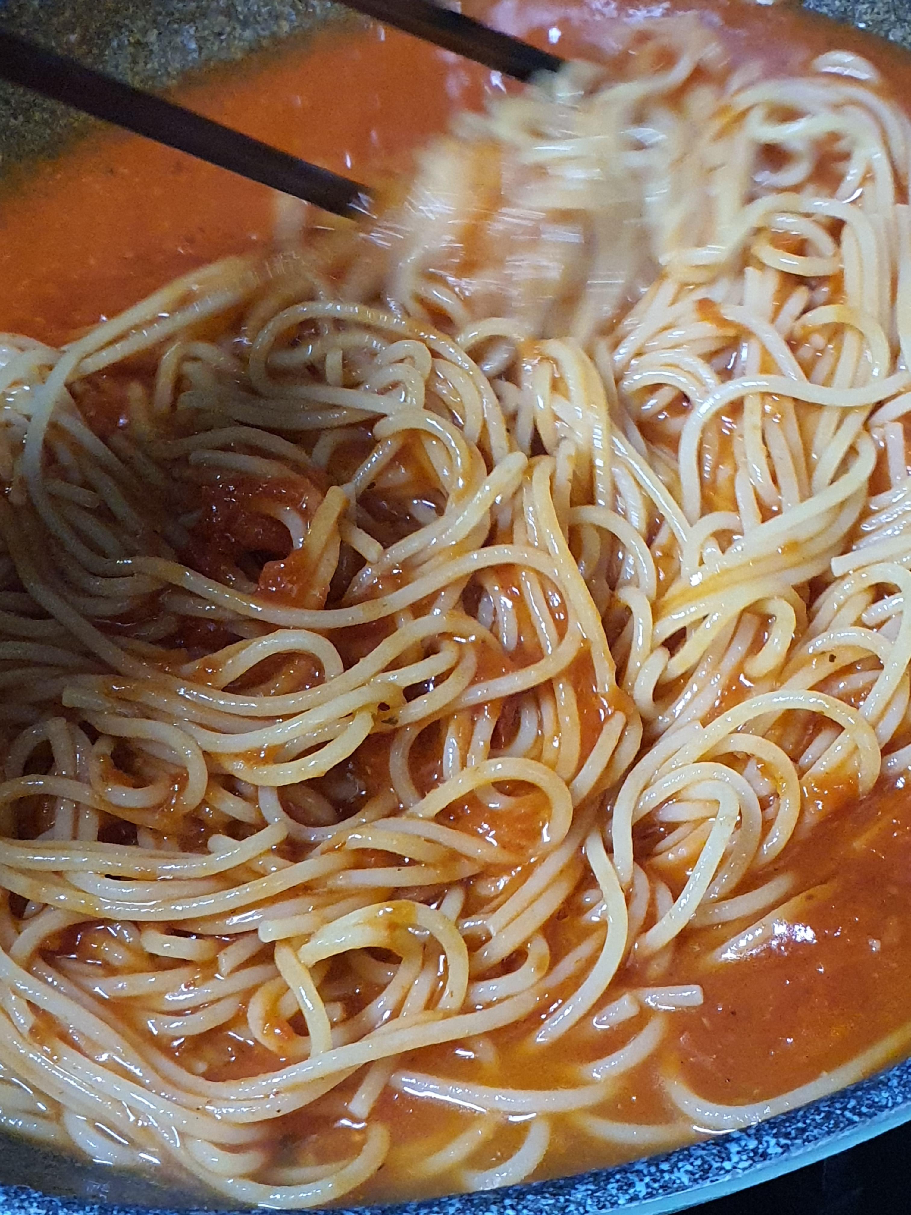 3. 웍에 물뺀 스파게티 면을 넣고 생합 삶은 물과 스파게티 소스를 넣고 5분 저어가며 끓여줍니다.