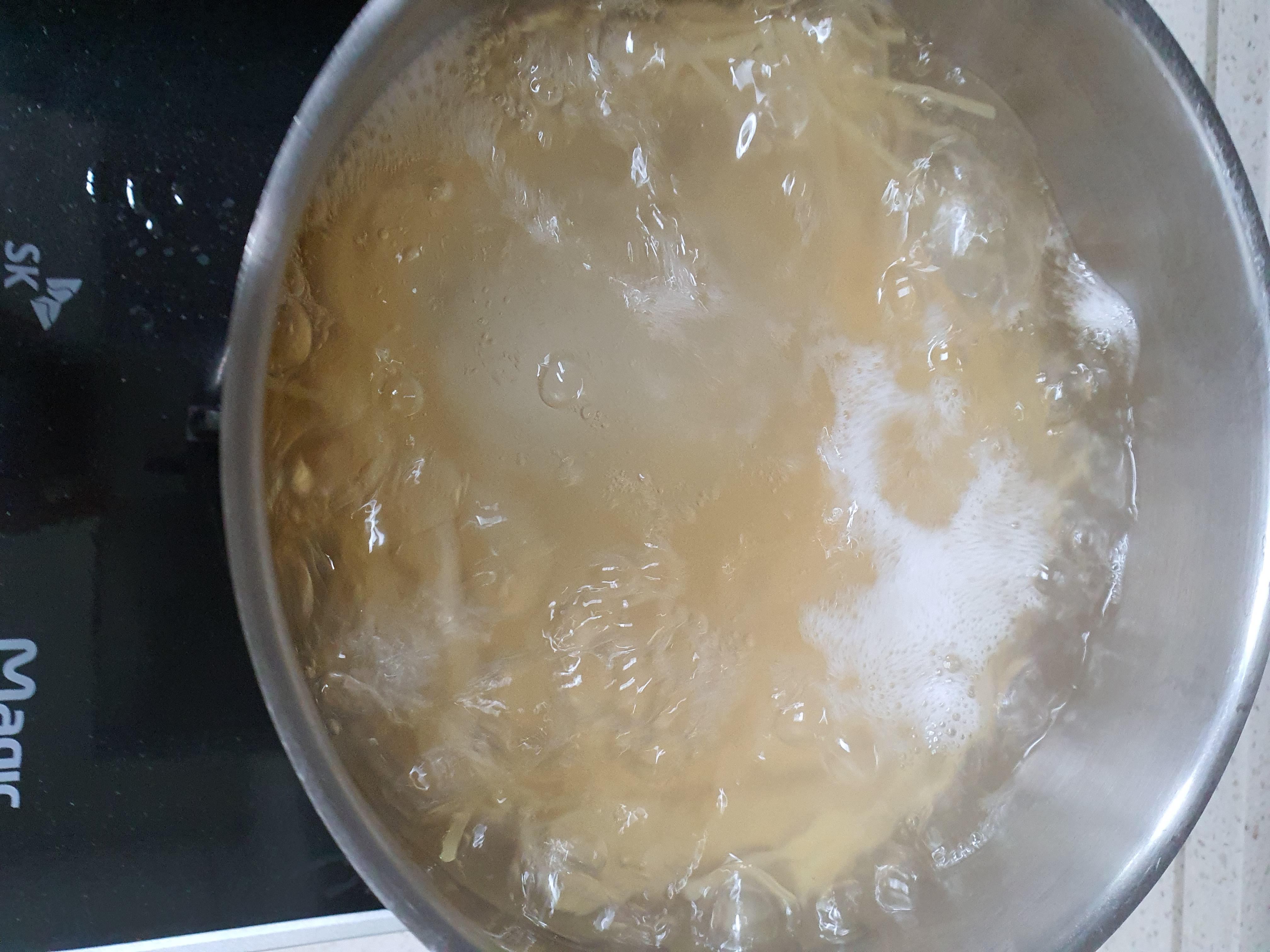 2. 물이 끓으면 스파게티면을 넣고 13분 끓여줍니다.
