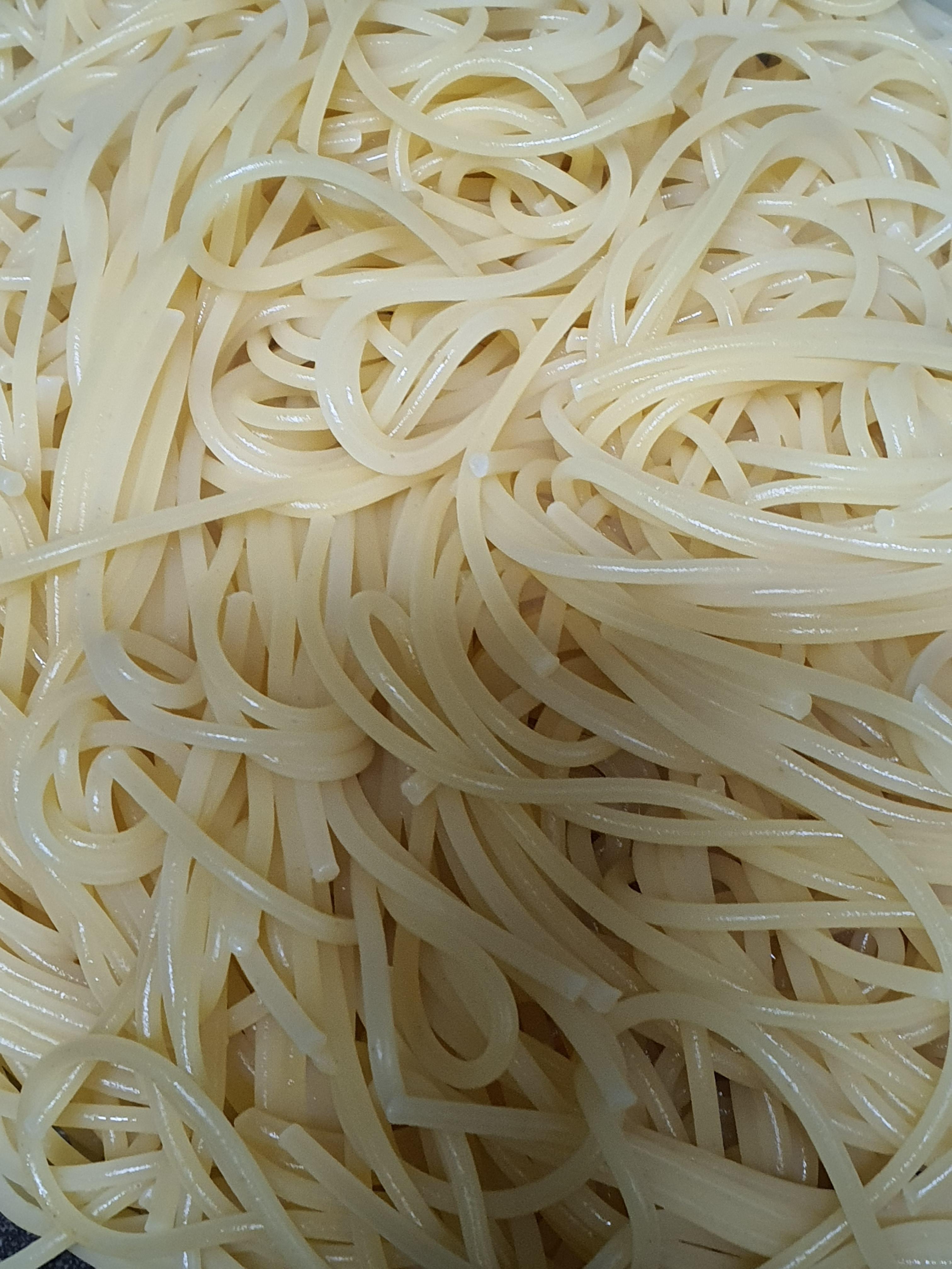 3. 스파게티 끓인 물을 1컵만 담아두고 스파게티 면을 채에 받쳐 물을 빼 놓습니다.