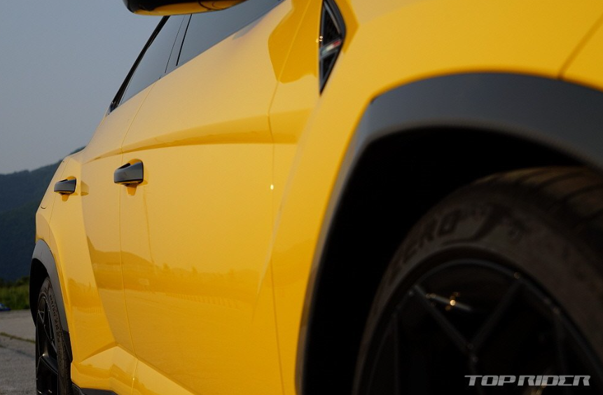 일상주행에서는 예상보다 편안한 승차감을 전합니다. 옵션 사양 23인치 휠의 편평비가 30~35 수준의 극단적으로 얇은 사이드윌을 지녔음을 고려했을 때 그렇습니다. 요철에 대한 초기 댐핑은 부드럽게 소화하지만 285~325mm의 광폭 휠과 편평비가 전하는 자질한 노면 반응은 있습니다.