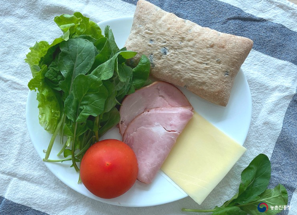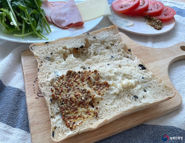 치아비타빵 1개, 루꼴라 10줄기, 쌈채소 4~6장, 토마토 1개, 슬라이스 햄 2장, 고다치즈 2장, 홀그레인머스터드 1큰술, 마요네즈 1큰술