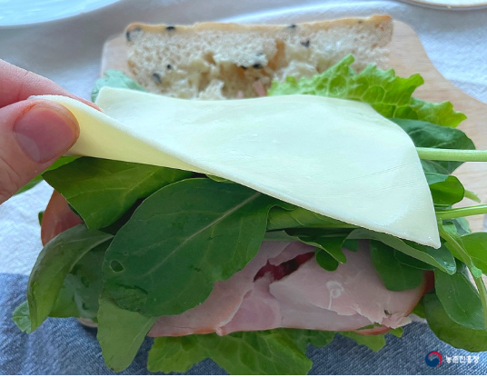 Tip : 평소에는 예쁜 단면을 위해 채소 → 햄 → 치즈 순으로 넣는데, 루꼴라의 풍미를 가득 느끼기 위해 쌈채소와 구분해 넣어주었습니다.