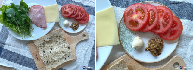 1. 루꼴라 10줄기와 쌈채소 4~5장을 깨끗하게 씻어 물기를 제거해 줍니다. 토마토 1개는 슬라이스 하고 슬라이스 햄 2장과 고다치즈 2장은 포장을 뜯어 준비해 줍니다.