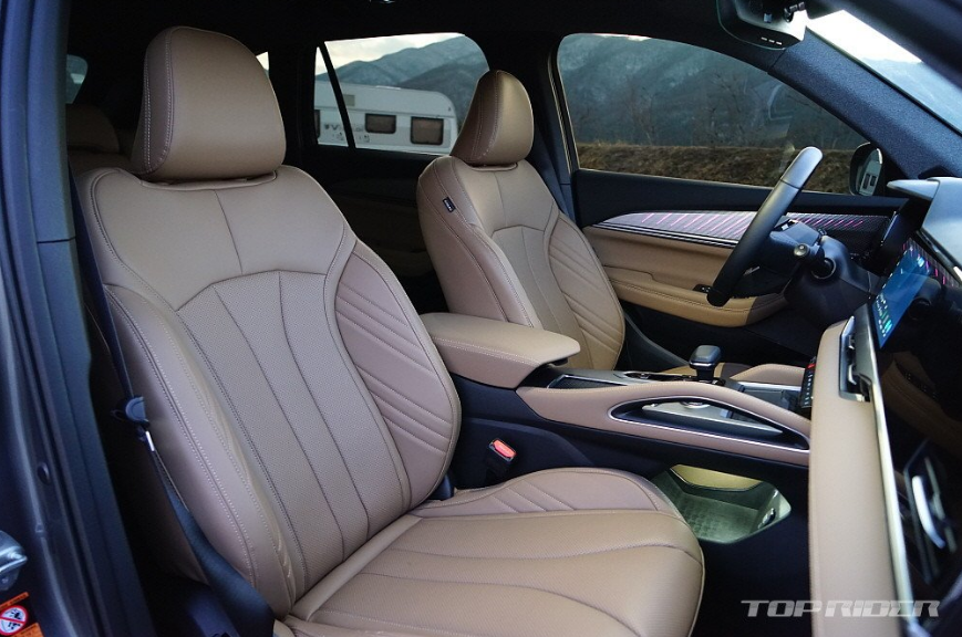 개인적으로 스웨이드 소재를 시트에 사용하는 것을 선호하지 않는데, 그랑 콜레오스는 영리하게 체중이 실리지 않는 디테일 부분에 선택적으로 스웨이드 소재를 사용, 감성적인 부분을 충족시키면서 더워지거나 체중에 눌리는 상황은 피했습니다. 나파 인조가죽은 촉감이 좋습니다.