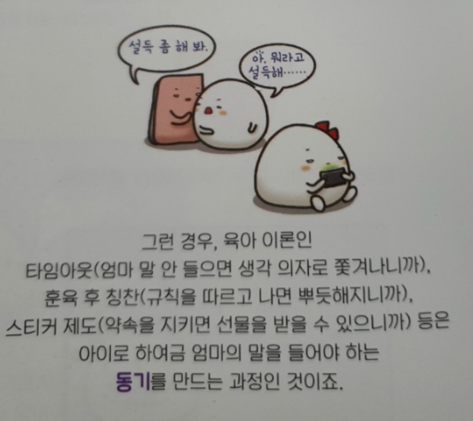 그런경우, 육아 이론인 타임아웃(엄마 말 안 들으면 생각 의자로 쫓겨나니까), 훈육 후 칭찬(규칙을 따르고 나면 뿌듯해지니까), 스티커 제도(약속을 지키면 선물을 받을 수 있으니까) 등은 아이로 하여금 엄마의 말을 들어야 하는 동기를 만드는 과정이라고 합니다.