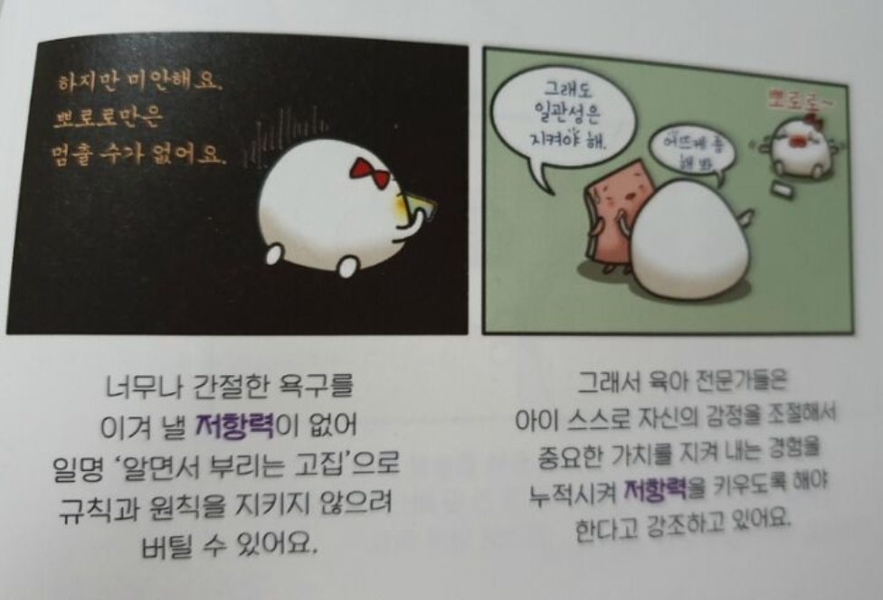 너무나 간절한 욕구를 이겨 낼 저항력이 없어 일명 '알면서 부리는 고집'으로 규칙과 원칙을 지키지 않으려 버틸 수 있다고 합니다. 그래서 육아 전문가들은 아이 스스로 자신의 감정을 조절해서 중요한 가치를 지켜 내는 경험을 누적시켜 저항력을 키우도록 해야 한다고 강조하고 있다고 합니다.