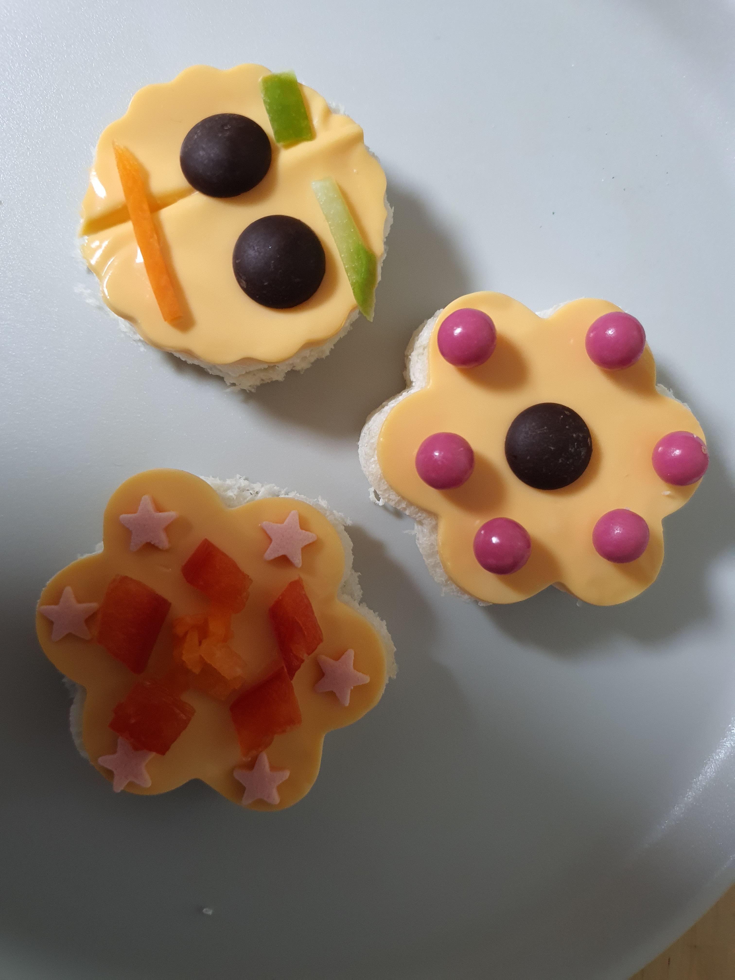 다양한 모양틀, 식빵, 치즈, 다양한 초콜릿 사탕 모양, 당근, 파프리카, 오이, 여러개의 그릇