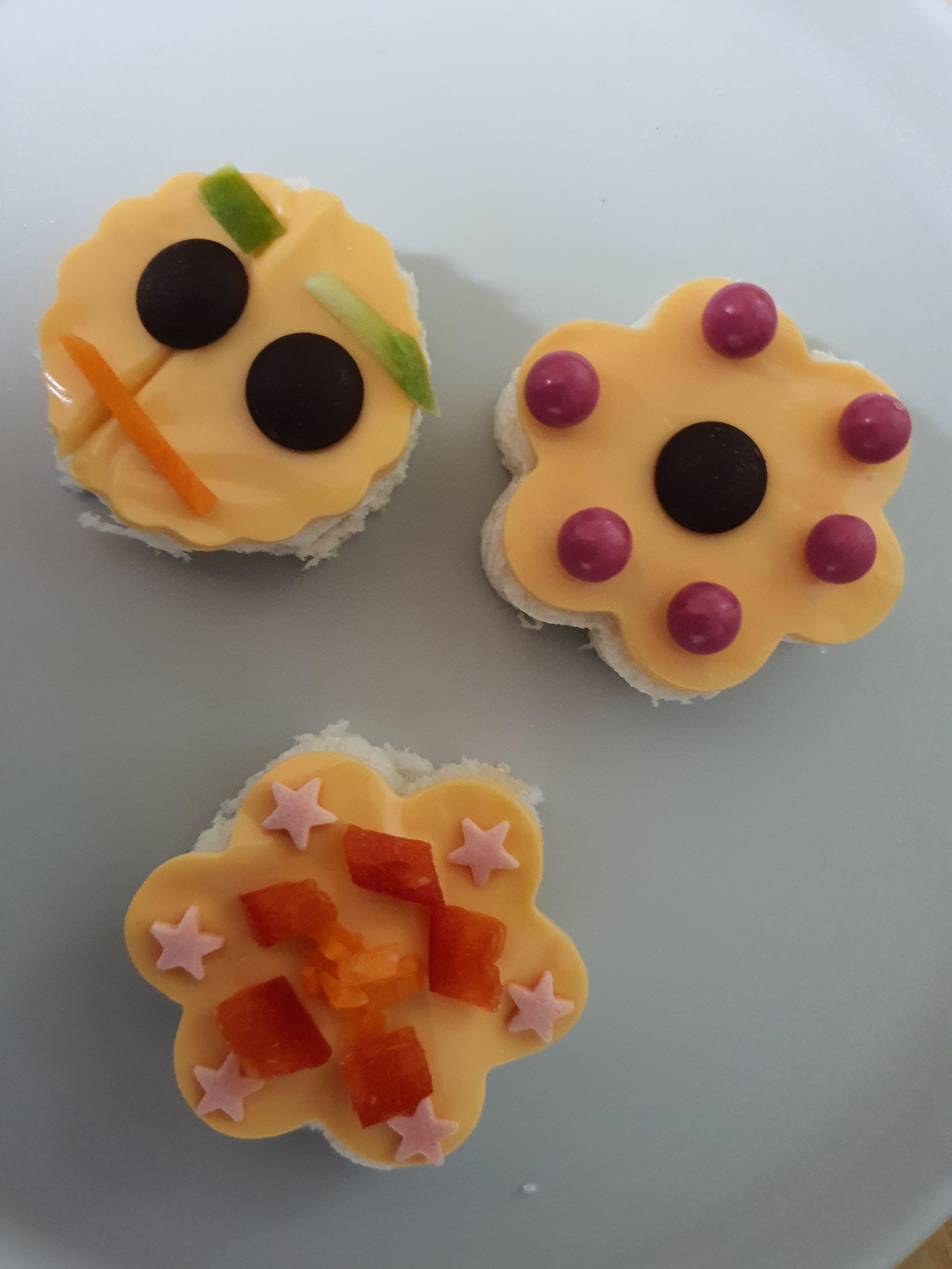 다양한 모양틀, 식빵, 치즈, 다양한 초콜릿 사탕 모양, 당근, 파프리카, 오이, 여러개의 그릇
