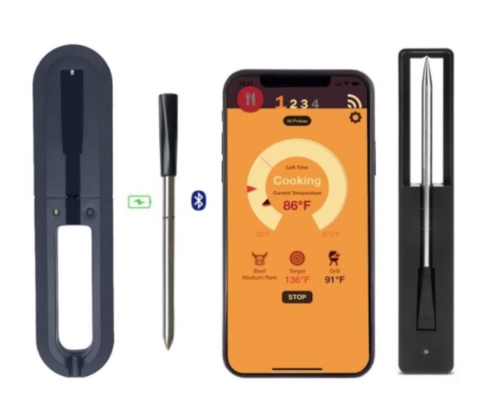 탐침 온도계는 고기를 굽거나 요리를 할 때 사용하는 온도계입니다. 스테이크를 잘 구우려면 내부 온도를 알아야 하고 온도를 측정하기 위해서 탐침 온도계를 사용합니다.