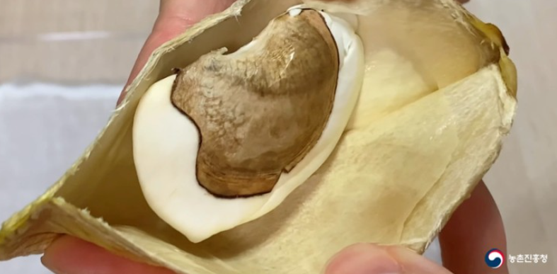 바짝 마른 망고 씨의 껍질을 벗겨보면 단단한 껍데기 속에 말랑말랑한 속살이 숨어 있습니다.