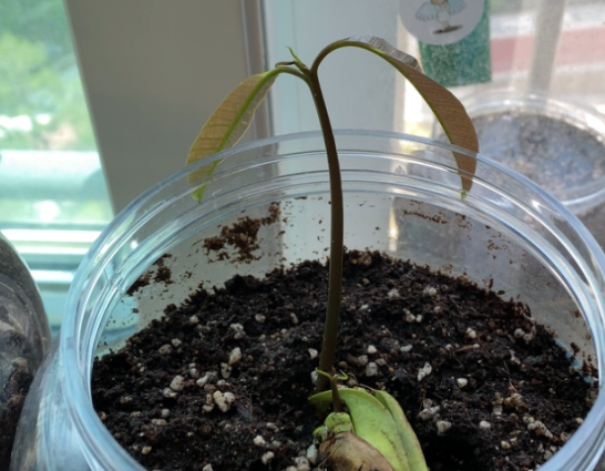 망고 씨를 화분에 옮겨 심은 뒤 일주일 지나면 새싹이 흙 위로 올라옵니다.