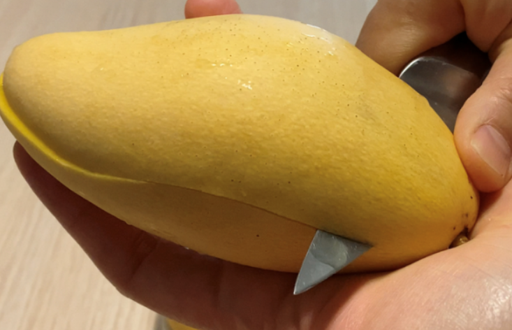 망고는 가운데에 아주 커다란 씨가 들어있습니다. 칼을 이용해 과육의 양쪽을 잘라내면 씨가 나오는데 과육은 맛있게 먹고, 망고 씨는 깨끗이 씻어 며칠 말려둡니다.