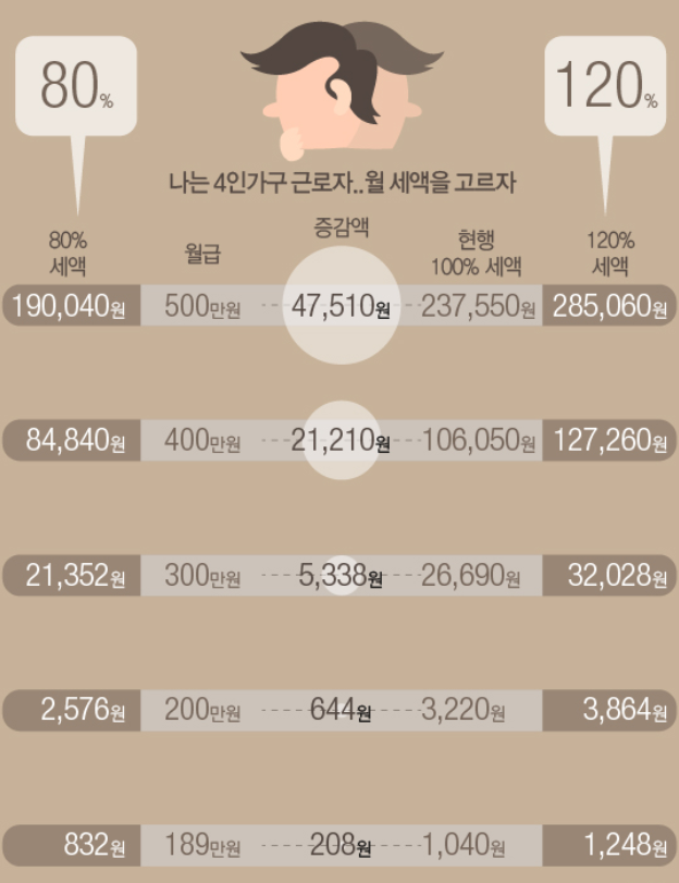 맞춤형 원천징수 제도는 근로소득 간이세액표상 원천징수세액을 80%, 100%, 120% 중 근로자가 선택 가능한 제도 입니다. 물론 선택하지 않을 경우는 기본 100%로 적용 된다고 합니다.
