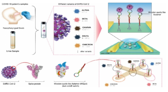 압타머(WQCSA, Wooden Quoit conformation structural Aptamer)를 반도체 접목, 전기화학적 반응을 통해 환자의 타액, 콧물, 땀, 뇨로부터 수초 내에 다양한 항원을 검출하는 비표지식 멀티 바이오센서를 개발한 세계 최초의 사례입니다.