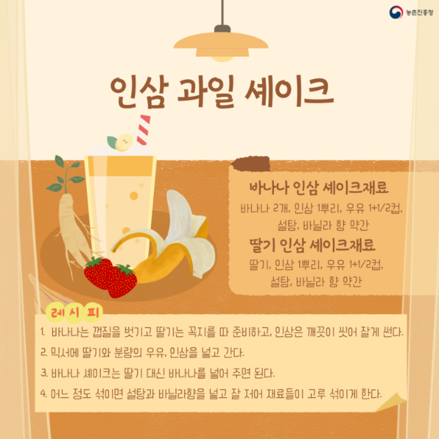 바나나 인삼 셰이크(바나나 2개, 인삼 1 뿌리, 우유 1컵반, 설탕 2큰술, 바닐라 향 약간), 딸기 인삼 셰이크(딸기, 인삼 1뿌리, 우유 1컵반, 설탕 2큰술, 바닐라 향 약간)
