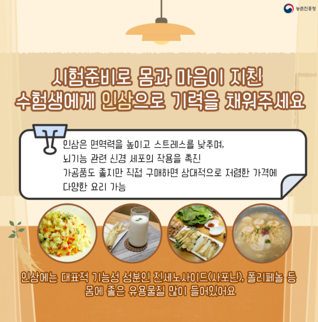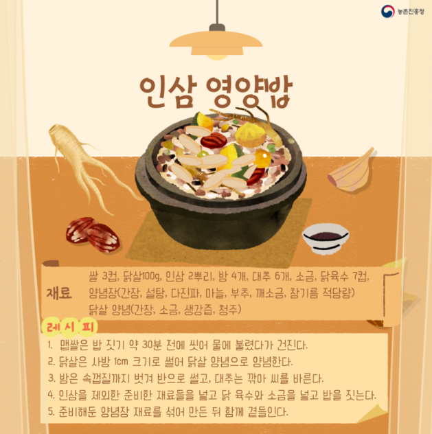 기력과 집중력을 높여줄 훌륭한 식재료 '인삼'으로 확실하게 건강관리하면 좋을 것 같습니다.