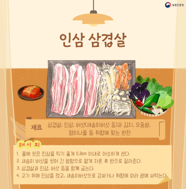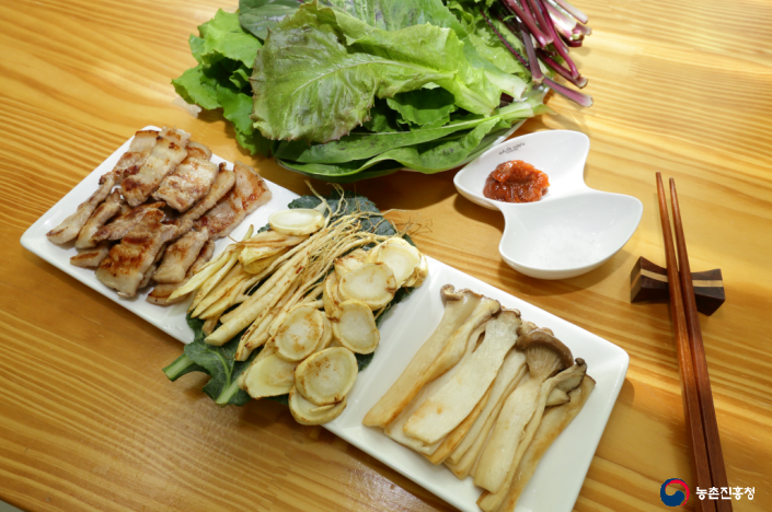 삼겹살, 인삼, 버섯(새송이버섯 등)과 김치, 모둠 쌈, 명이나물 등 취향에 맞는 반찬
