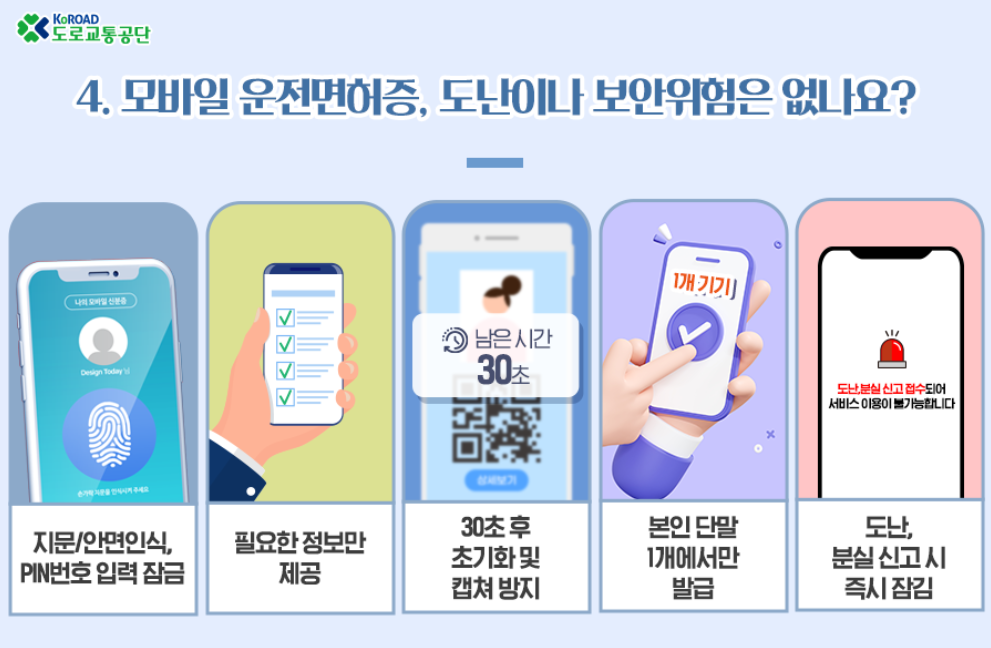 모바일 운전면허증은 도용 방지 및 개인 정보 노출 최소화를 위해 다양한 보안 기술을 적용해, 안시하고 사용할 수 있습니다.