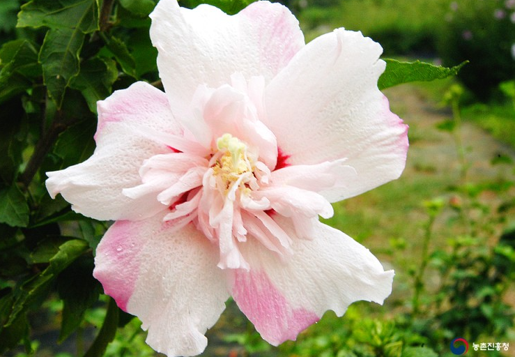 하지만 잎 가장자리가 매끈하지 않고 갈라져 있지 않습니다. 개화시기 역시 6~9월로 무궁화보다 약간 더 빠릅니다.