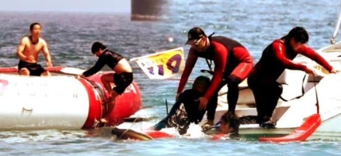 ★ 물속으로 떨어졌을 때는 즉시 수면으로 올라와 배를 붙잡아야 하고 잠시 휴식한 후 배뒷 쪽으로 돌아와서 몸을 솟구쳐 상체부터 올려놓는다.