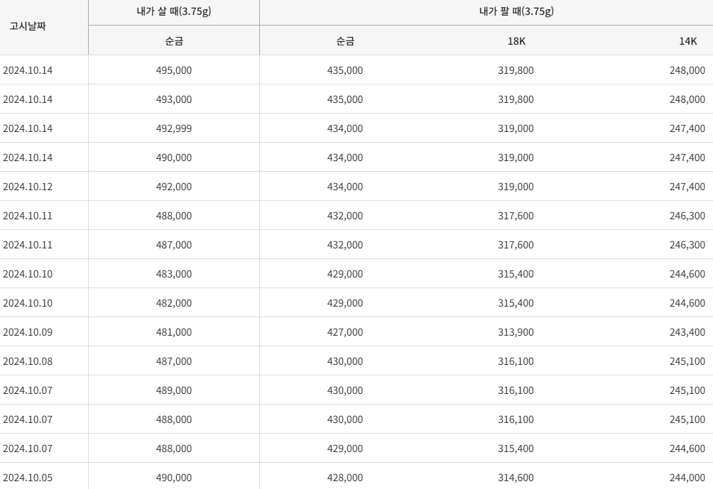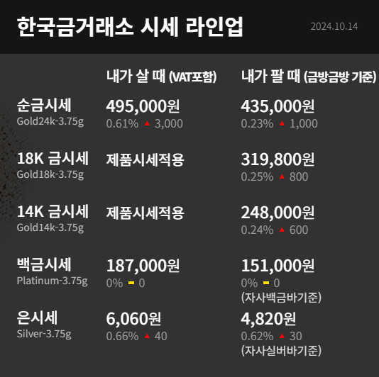 10월 14일 마감기준 내가살때 기준 24k 금시세 기준 금값시세는 3.75g당 전날 마감 시세보다 3,000원 상승한 495,000원을 기록하고 있습니다.
