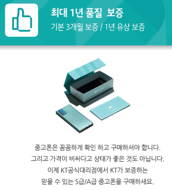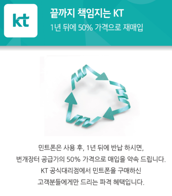 KT는 민트폰이 최대 1년의 품질보증 기간을 제공하며 구매가의최대 50%를 보장해 1년 뒤 재매입하는 바이백(Buy-Back) 옵션도 기본으로 제공하는 점이 특징이라고 설명했다고 합니다.
