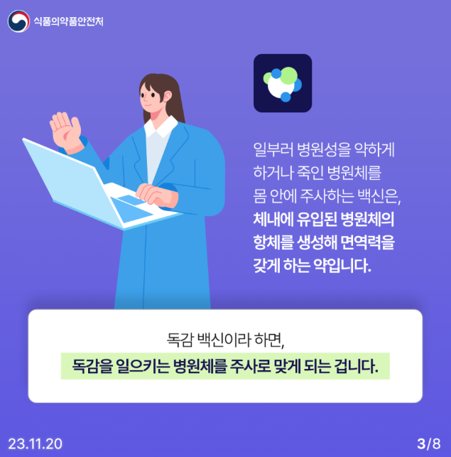 일부러 병원성을 약하게 하거나 죽은 병원체를 몸 안에 주사하는 백신은, 체내에 유입된 병원체의 항체를 생성해 면역력을 갖게 하는 약입니다.